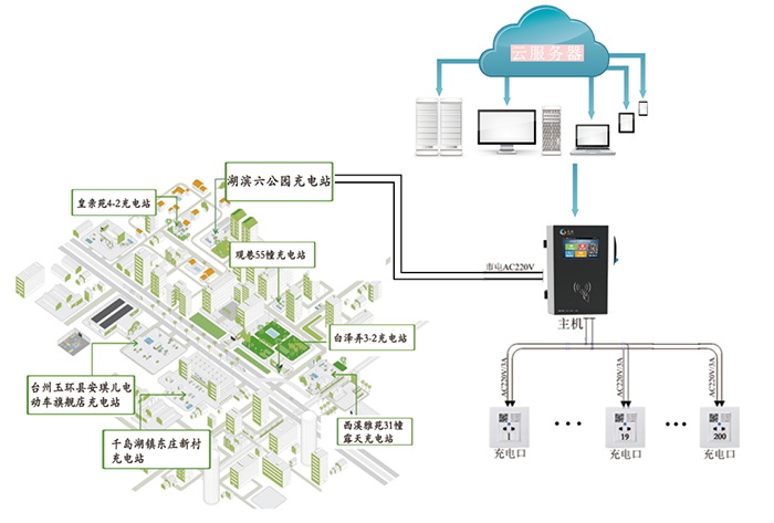 • 充電樁數(shù)量靈活配置(一臺主機(jī)可掛載5~200個(gè)充電樁)